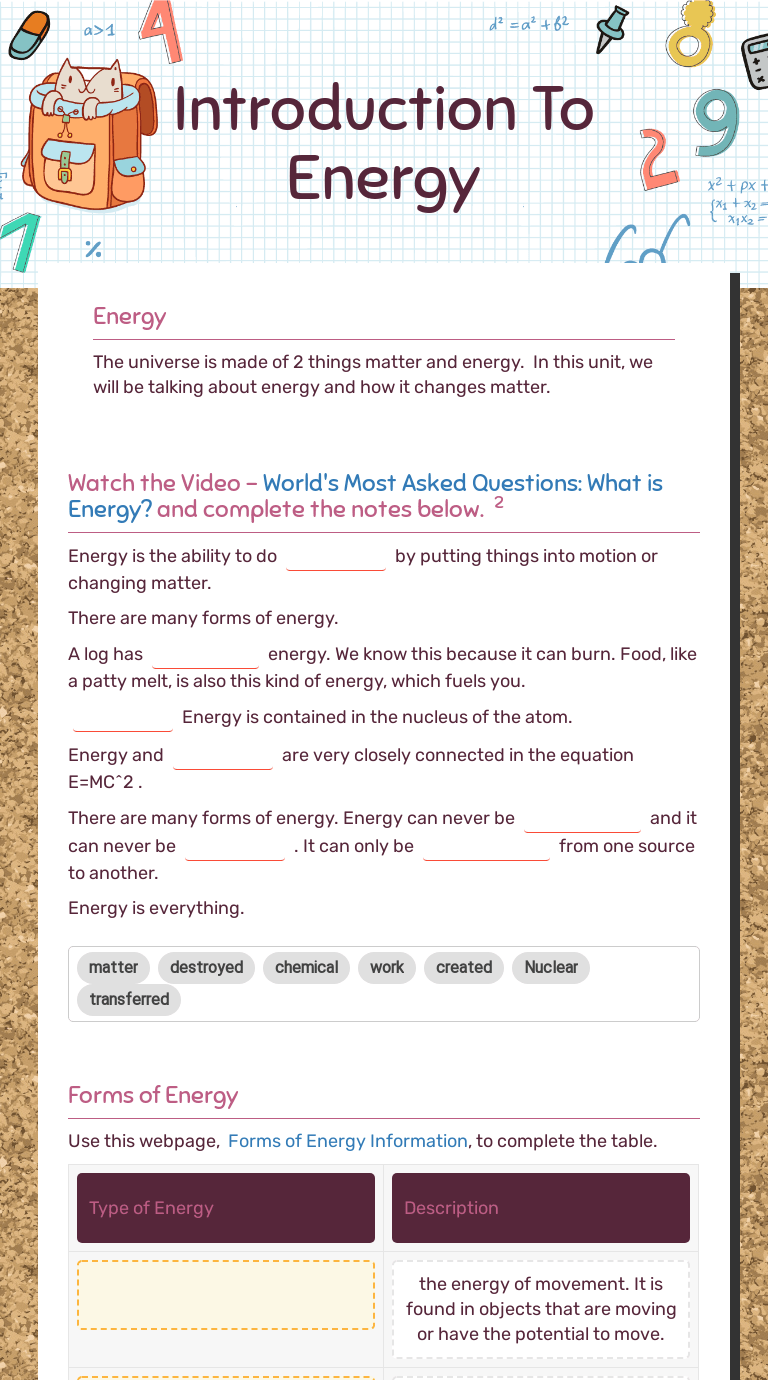 17.0 introduction to energy worksheets. Worksheets contain one of the following: Classify the following as a type of potential energy or kinetic energy (use . "introduction to energy" worksheet dcs k12 oh us. This worksheet pairs well with my forms of energy doodle notes! Worksheet or scaffolded notes for students to practice and organize . 1 forms of energy is an introduction to the many forms of . Browse energy introduction resources on teachers pay teachers,.